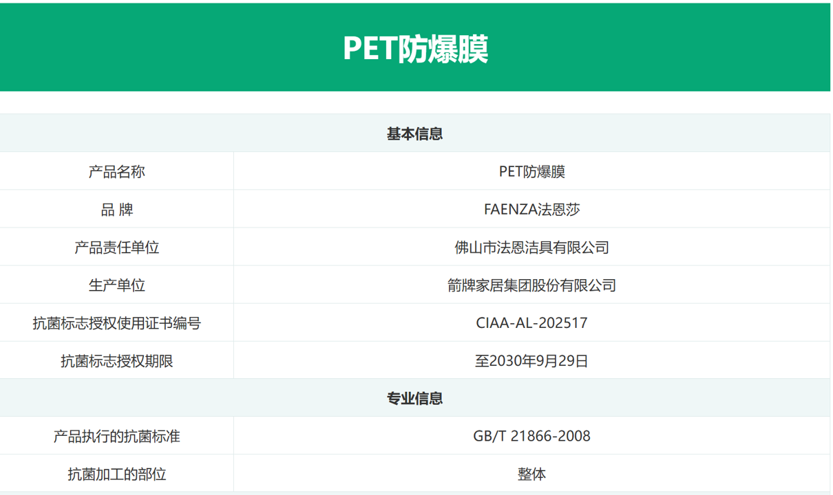 箭牌、安華和法恩莎品牌PET防爆膜同獲抗菌標志使用授權