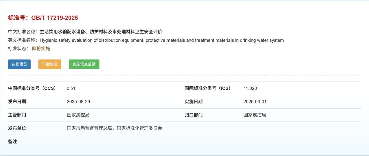 GB T 17219-2025《生活飲用水輸配水設備、防護材料及水處理材料衛生安全評價》已經于近日發布,將于2026年3月1日正式實施。生活飲用水安全